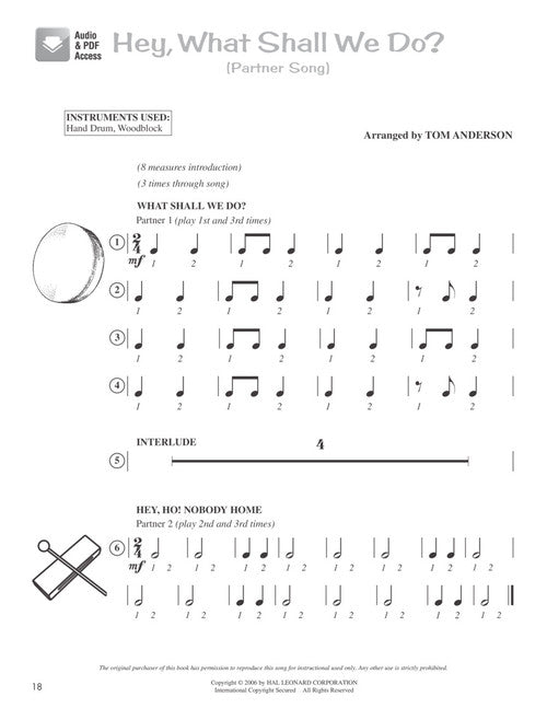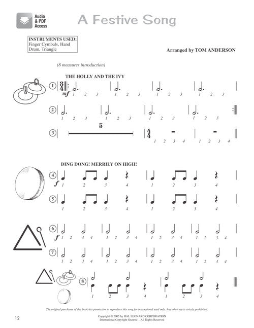 Grab those metals, woods and membranes because it's time for some percussion discussion! Actively involve your students with easy-to-follow read and play parts to accompany familiar folk songs, marches, spirituals, holiday favorites and more. More advanced readers play from musical notation, while beginning readers follow instrument pictures. For added play along fun, rehearse with the demonstration tracks when learning the parts, and then use the motivating and hip accompaniment tracks when you are ready to perform! Perfect for classroom or stage, these 14 songs will provide percussion fun throughout the year. For extra value, all the written music is reproducible, and five songs offer singer parts. Let's get discussin'! Suggested for Grades 1-6. Audio is accessed online using the unique code inside the book and can be streamed or downloaded. The audio files include PLAYBACK+, a multi-functional audio player that allows you to slow down audio without changing pitch, set loop points, change keys, and pan left or right.