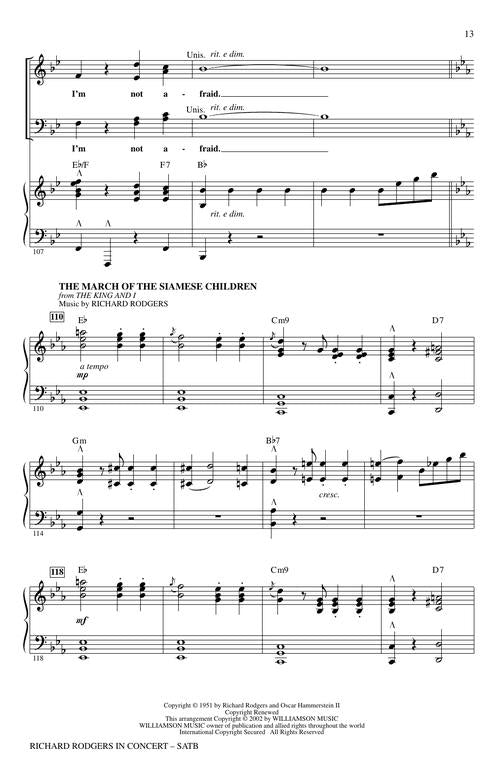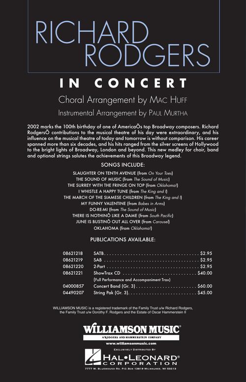 2002 marks the 100th birthday of one of America's top Broadway composers. Richard Rodgers' contributions to the musical theatre of his day were extraordinary, and his influence on the musical theatre of today and tomorrow is without comparison. His career spanned more than six decades, and his hits ranged from the silver screens of Hollywood to the bright lights of Broadway, London and beyond. This new medley for choir, band and optional strings salutes the achievements of this Broadway legend. Songs include: Do-Re-Mi, I Whistle a Happy Tune, June Is Bustin' Out All Over, The March of the Siamese Children, My Funny Valentine, Oklahoma, Slaughter on Tenth Avenue, The Sound of Music, The Surrey with the Fringe on Top, There Is Nothin' Like a Dame.Available separately: SATB, SAB, 2-Part, Concert Band (Gr. 3), String Pak and ShowTrax CD. Performance Time: Approx. 9:15.