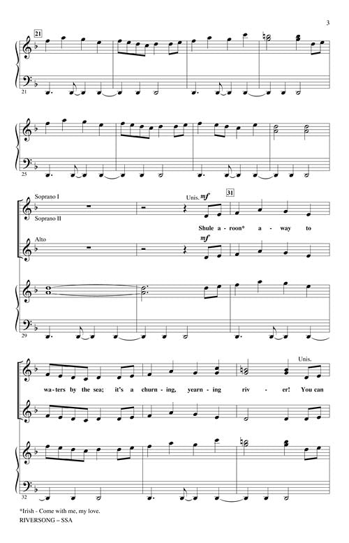 Now available for SSA voices! This vivid and popular original captures the spark and color of the celebrated Irish musical tradition. Dance to the tune, sing to the moon, aye, shule a-roon; let the river take you! Available separately: SATB, SAB, SSA, TTBB, 2-Part, ShowTrax CD, Instrumental Pak (rec/fl, vn, mdl/gtr, b, dm, perc). Duration: ca. 4:00.