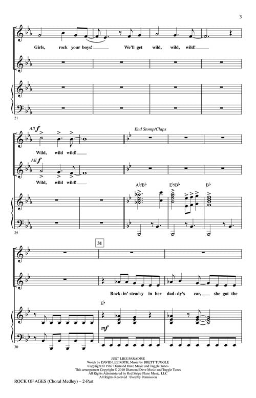 Broadway's hot ticket explodes in an arena-rock love story of scorching guitar solos, big hair and hot hits from the 1980s! Opening Act I, this mini-medley is a powerhouse salute to the past with three classic songs of the era. A super feature for pop and show groups, it includes: C'm on Feel the Noize, Just Like Paradise, Nothin' but a Good Time. Available separately: SATB, SAB, 2-Part, ShowTrax CD. Rhythm parts available as a digital download (syn, gtr 1, gtr 2, b, dm). Duration: ca. 4:00.