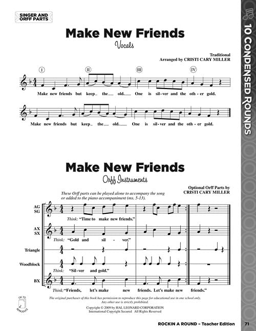 It's time to get a round to it! Experience part-singing fun your students will want to perform again and again. This rockin' collection of 16 rounds features some familiar and some brand new rounds, crafted with unique piano accompaniments that bring the arrangements to life. Six of the rounds come in an expanded format with a separate CD recording of full performance and accompaniment tracks for easy programming. The remaining ten rounds offer additional simple Orff accompaniments and riser choreography for many classroom and performance opportunities. All this and reproducible singer pages are featured in the Teacher book. For extra value, the Classroom Kit includes book and CD. Recorded rounds include: A Ram Sam Sam, Rockin' a Round, Row Your Boat, Songs of the Seasons, Sunshine, White Coral Bells. Non-Recorded Rounds include: Autumn Blessings, By the Singing Water, Frog Music, Make New Friends, Music Alone Shall Live, Now Is the Time to Sing, Peace Round, Sing Lullaby, Spring Thing, We'll Get a Round to It. Available separately: Teacher Edition (with reproducible singer pages), Performance/Accompaniment CD, Classroom Kit (Teacher and P/A CD). Suggested for grades 3-6.