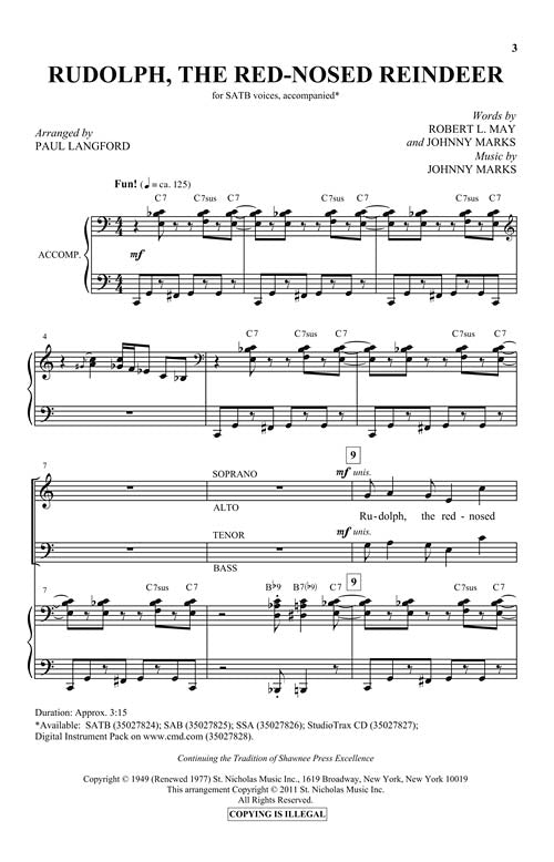 This Robert May and Johnny Marks' Christmas favorite is reborn in this bright arrangement by Paul Langford. The track makes you smile and Paul's thoughtful arrangement makes it easy to learn and sing. Available separately: SATB, SAB, SSA, Digital Instrument Pack (trumpet, t.sax, trombone, drums, bass, guitar/rhythm), StudioTrax CD. Duration: ca. 3:09.