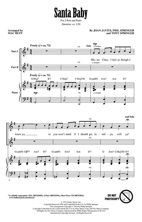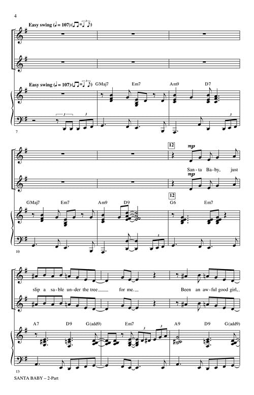 Now available in a 2-part voicing! A Christmas list for all the good big girls! This light-hearted classic is a sweet and saucy change-of-pace for girl groups everywhere! Santa Baby, hurry down the chimney tonight!