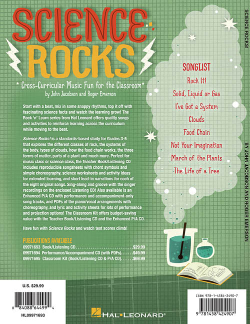 Science Rocks! is a standards-based study that explores the different classes of rocks, the systems of the body, types of clouds, how the food chain works, the three forms of matter, parts of a plant and much more. Perfect for music class or science class, the Teacher Book includes reproducible songsheets with chord symbols and simple choreography, science worksheets and activity ideas for extended learning, and short lead-in narrations for each of the eight original songs. Sing-along and groove with the singer recordings on the enclosed Listening CD! Also available is an Enhanced P/A CD with performance and accompaniment-only song tracks, and PDFs of the piano/vocal arrangements with choreography, and lyric and activity sheets for lots of performance and interactive board options! Have fun and watch test scores climb! Available separately: Book/Listening CD, Enhanced CD and Classroom Kit. Suggested for grades 3-5.