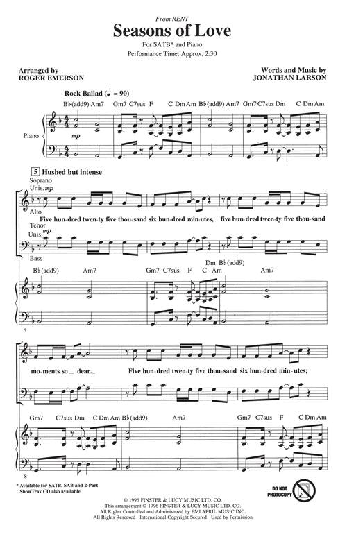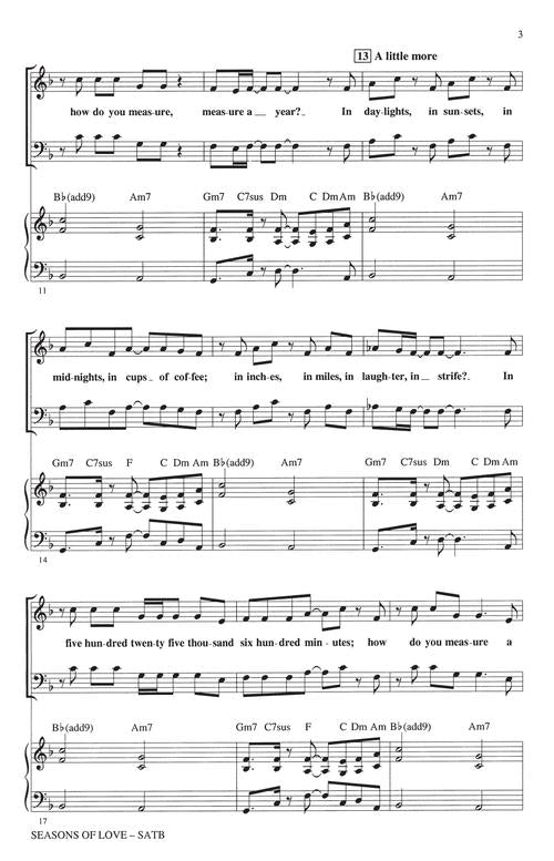 This is the showstopping number from the dramatic Broadway mega-hit Rent. This edition is based on the Stevie Wonder pop version included on the cast recording. Great choral writing and a fantastic lyric message. Available: SATB, SAB, SSA, 2-Part, ShowTrax CD. Performance Time: Approx. 2:30.