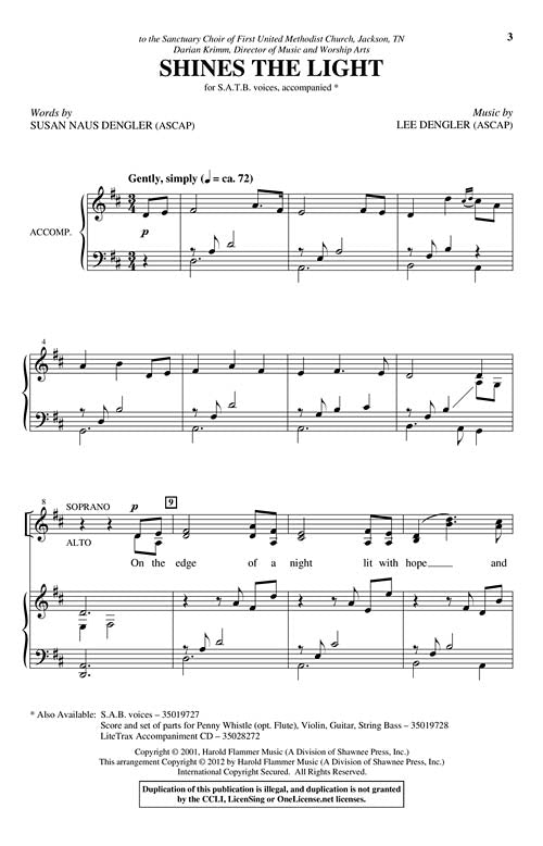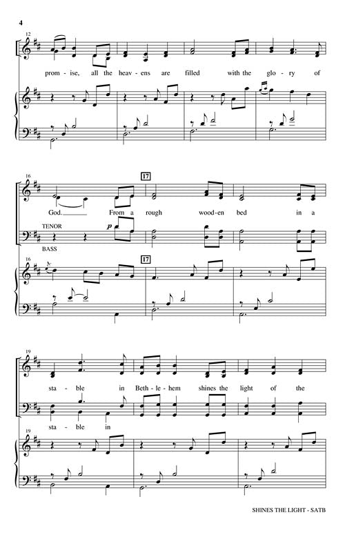 A simple, beautiful Celtic sounding original melody is combined with a fresh and stirring text. This tender folk song calls the listener to look beyond the cradle to the cross. Shines the Light is a timeless piece and is appropriate for all times of the year as Christ, the Light, is laid in a manger, walks among us, and is hung on the cross. Score and Parts (pwhis/fl, vn, gtr, stb) available as a digital download.