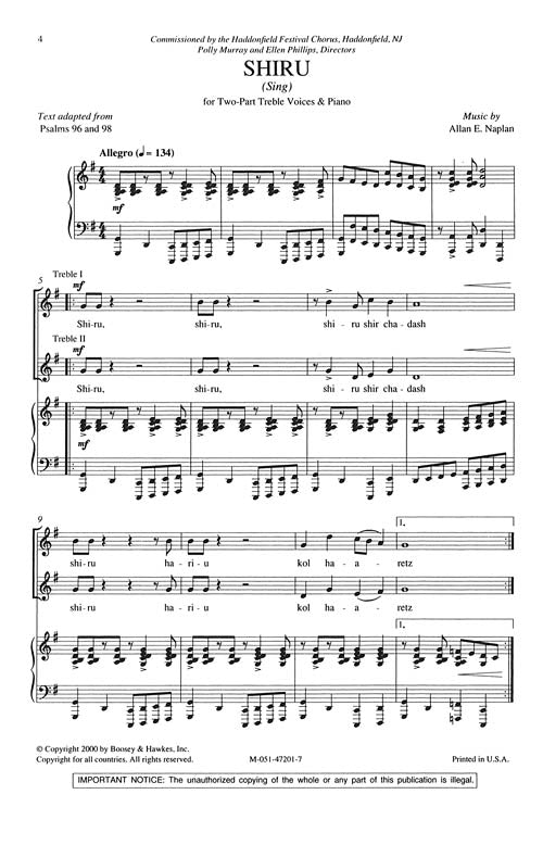 Just as a lively gospel song inspires spirit through upbeat tempos, rousing shout choruses and high-lying vocal tessituras, Shiru (Hebrew for sing) accomplishes much of this same musical enthusiasm. Shiru is filled with natural syncopations, flowing harmonic lines and even the aforementioned shout chorus, all of which clearly illustrate the poetry's enthusiasm for all the earth to sing a new song!