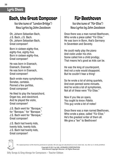 Did you know . . . Bach had twenty kids; Beethoven lost most of his hearing by the time he was an adult; Haydn's parents sent him off to study music at the age of six; Mozart was performing for kings and queens by age five? Learn a wealth of interesting and fun facts about 10 famous composers with this delightfully whacky collection of familiar melodies set to new lyrics. Perform songs live with piano accompaniments in the Teacher Edition or use the professionally-produced recordings available separately on the Performance/Accompaniment CD. Choreography is also included along with reproducible lyric sheets. Enhance learning further with reproducible composer bios and review questions, and a comprehensive word search and crossword puzzle for a final check of the facts! Available separately: Teacher Edition (with reproducible pages), Performance/Accompaniment CD, Classroom Kit (Teacher & P/A CD). Suggested for grades 3-6.