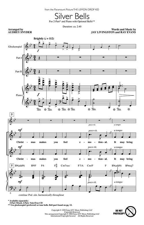 This well-loved Christmas song was made popular by Bing Crosby and celebrates the wonderful sights and sounds of Christmastime in the city. Perfect for younger singers! Available separately: 3-Part Mixed, 2-Part, VoiceTrax CD. Duration: ca. 2:40.