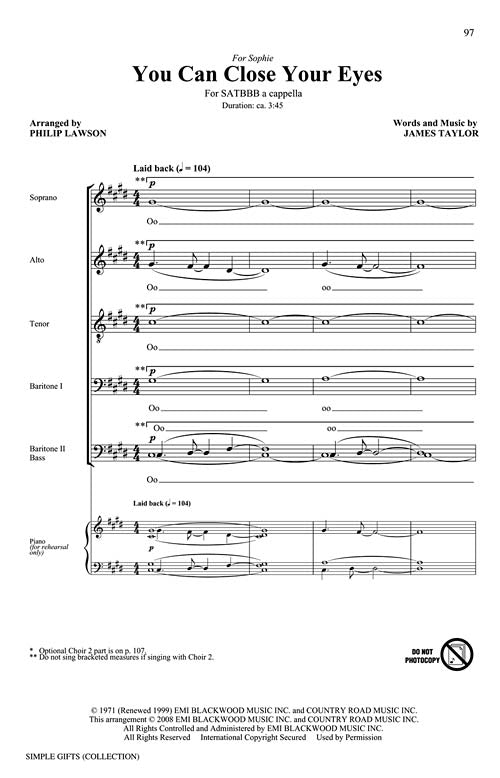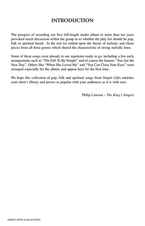 Based on their Grammy® Award-winning album, this compilation by The King's Singers features an eclectic collection of songs. A stunning variety of folksongs, spirituals and pop songs, this songbook includes: Black Is the Color of My True Love's Hair, Deep River, The Gift to be Simple, Helplessly Hoping, I Love My Love, She's Always a Woman, The Turtle Dove, Valparaiso, When She Loved Me, You Are the New Day, You Can Close Your Eyes.