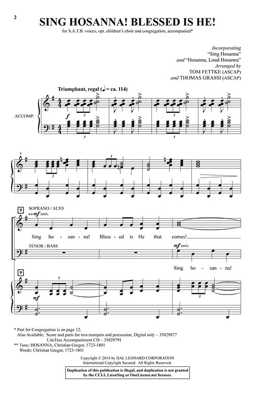 Uses: Palm Sunday, Call to Worship Scripture: Mark 11:8-10; John 12:12-13 A fanfare of praise, this festive Hosanna is a wonderful exclamation point to the Triumphal Entry. Whether as a special music moment or as the soundtrack for a procession of palms, this regal choral piece is a solid choice. Incorporating the time-honored Hosanna, Loud Hosanna is a welcome touch and will bring a convincing power to your presentation. Add the children's choir, and you'll have a memorable moment for Palm Sunday. Epic! Score and parts (2 tpts, perc) available as a digital download.