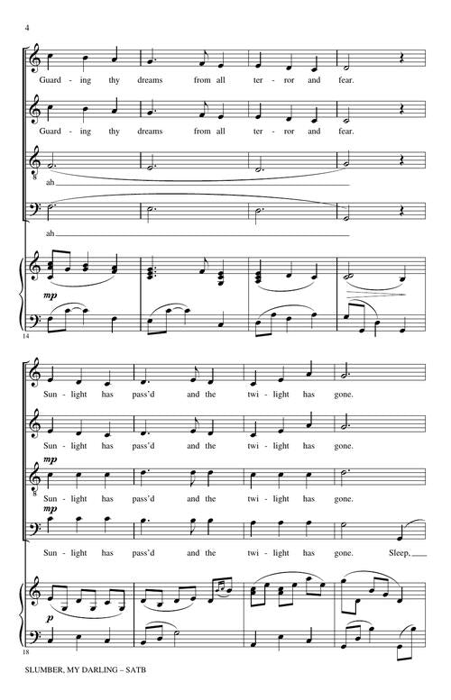 Slumber My Darling is one of Stephen Foster's more mature compositions, displaying the melodic dignity associated with German Romanticism. Using a soft rolling accompaniment that alternates with a cappella sections, this arrangement for SATB choir has a wonderfully delicate and gentle spirit, evoking a lullaby.