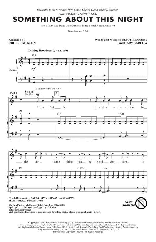 Sparkling with the spirit of Broadway magic, Something About This Night (from Finding Neverland) comes alive in this showstopping choral arrangement by Roger Emerson. Stellar vocal parts offer energetic opportunities for solo vocalists to shine. Easy to learn, yet instantly impressive.