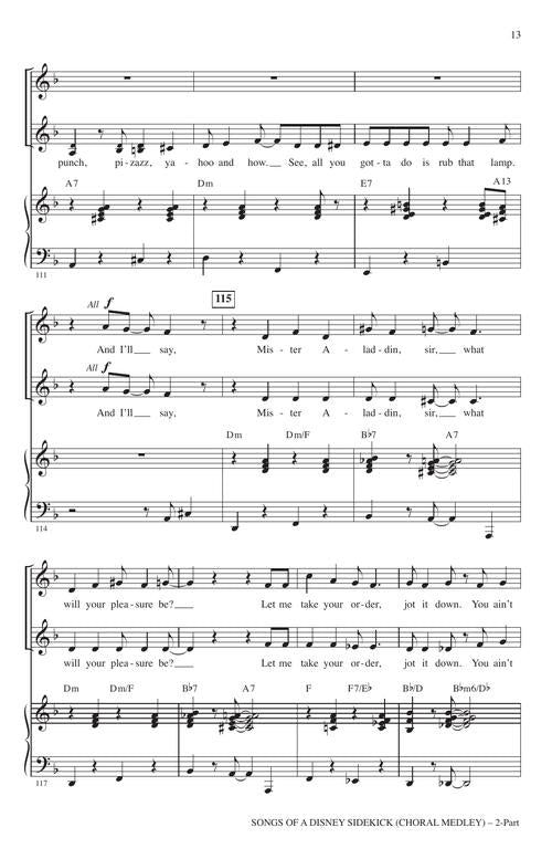 There are Disney heroes and there are Disney villains, but this rip-roaring barn-burner of a choral arrangement belongs to those fringe characters that inhabit the sideline of the story. They make us chuckle, cry, swoon, and offer up the invaluable support that the leads often need more than anything: Disney sidekicks. Includes: nder the Sea he Bare Necessities Friend Like Me, Hakuna Matata, and Be Our Guest.