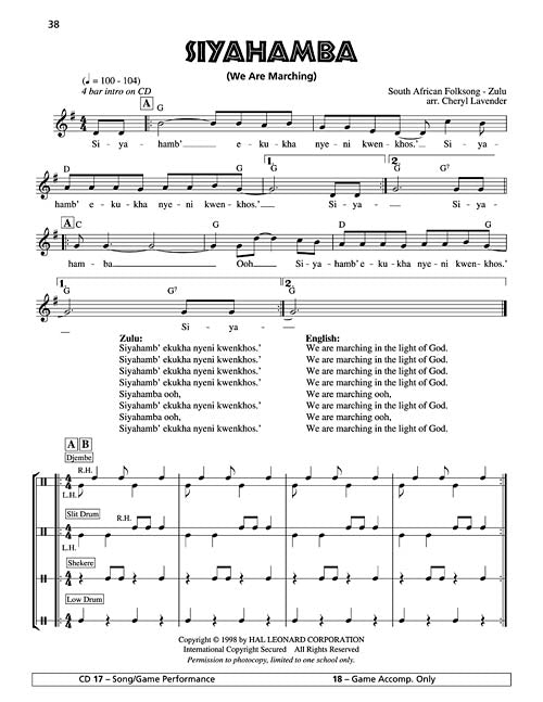 Experience the music, the history and culture of the rainbow children of South Africa with this exciting collection of 8 authentic folk songs and games by Cheryl Lavender. Comes complete with teaching and performance suggestions, instrumental accompaniments, and movement patterns. These songs, arranged for 2-Part, 3-Part, and 4-Part Treble voices, were gathered during her 'teacher to teacher' trip to South Africa in October of 1996. Songs include: 'Impuku Nekati', 'Ra Sila Mielie', 'Thula Thu'', 'Mangwani Mpulele', 'Singabahambayo', 'Siyahamba', 'Jikel' Emaweni', 'N'kosi Sikelel' I Afrika'. Available: Song Collection, CD (Performance/Accompaniment). For All Ages!