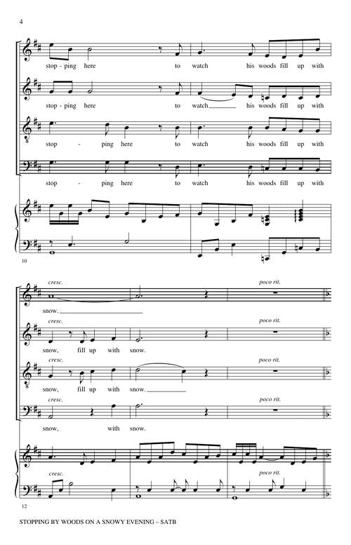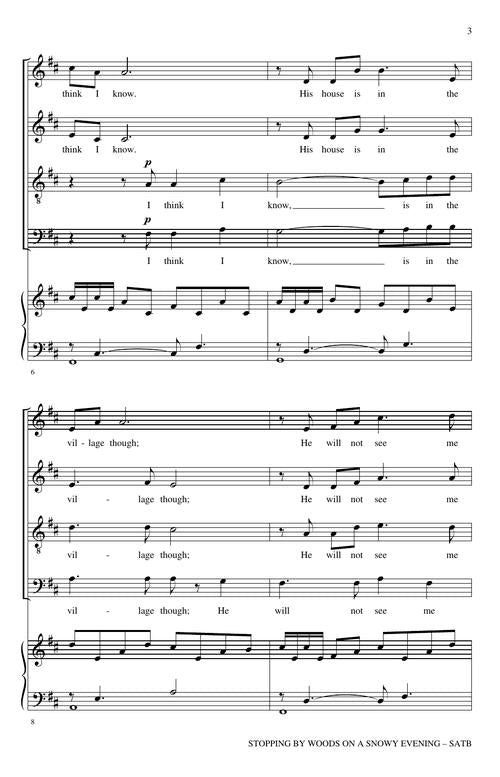 Robert Frost's poem is a literary work loved and interpreted for decades making this an important choral for singers to learn and perform. The serene piano accompaniment establishes the introspective mood and tranquil vocal lines weave with dynamic interest within melodic and harmonic beauty. A gorgeous selection for winter, holidays and any time inspirational texts are programmed.