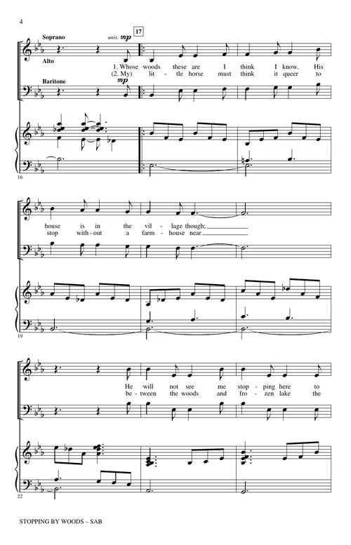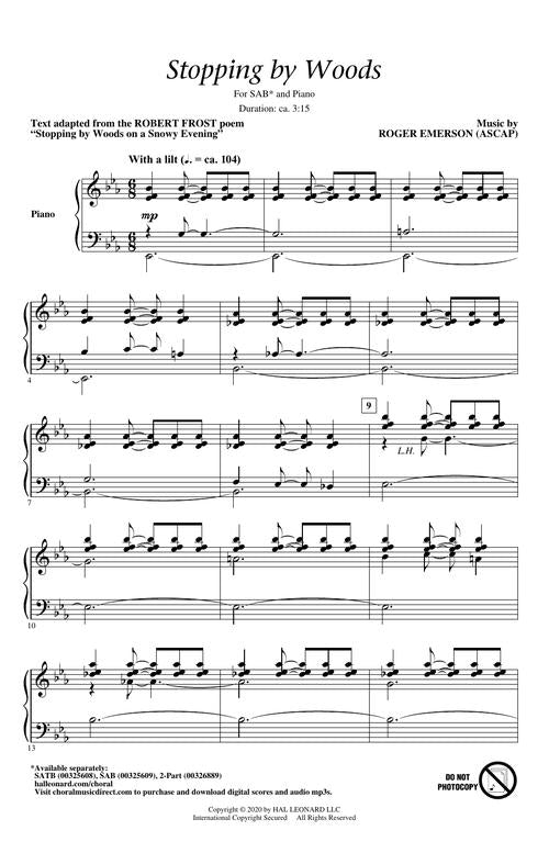 When you read the prose of Robert Frost's Stopping by Woods on Snowy Evening, you may be struck by the beautiful imagery and quaint mood that the text conjures. Roger Emerson's brilliant choral setting of this classic American poem takes the form and structure of the (mostly) monosyllabic text and weaves a modern, familiar and truly breathtaking musical interpretation akin to a brisk, moonlit gallop of a horse and its rider! Outstanding!