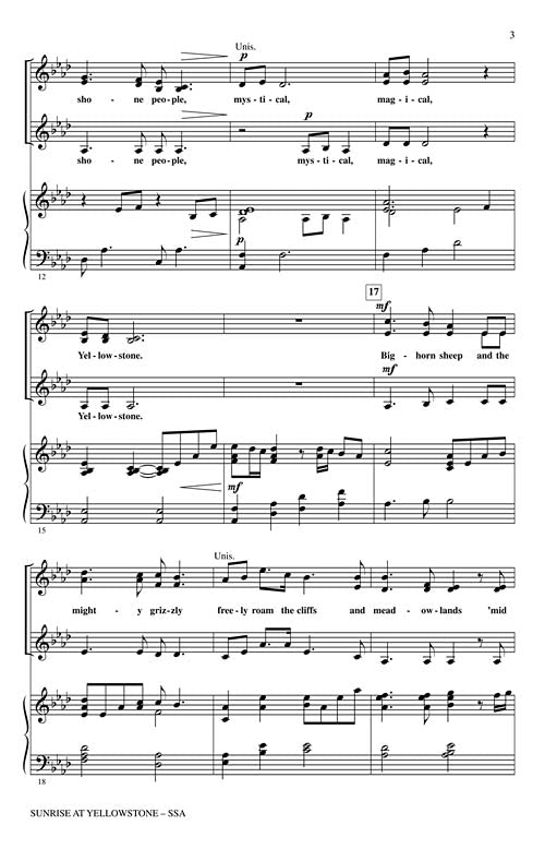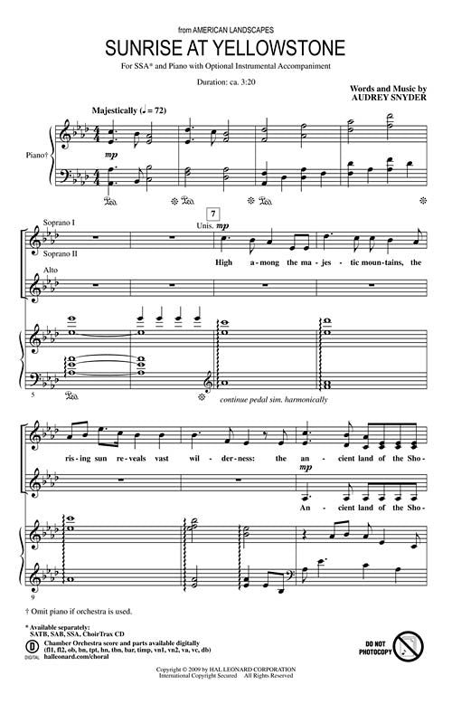 The mystery and majesty of Yellowstone is perfectly portrayed in this choral tone poem that celebrates the beauty of this American treasure. An ideal concert and festival work, it may be performed by voices and piano or with the optional orchestration. Available separately: SATB, SAB, SSA, ChoirTrax CD. Chamber Orchestra score and parts available digitally (fl1, fl2, ob, bn, tpt, hn, tbn, bar, timp, vn1, vn2, va, vc, db). Duration: ca. 3:20.