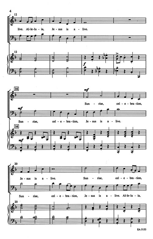 Uses: Easter, Easter Sunrise Scripture: Luke 24:1-12 Sunrise Resurrection has the spirit of an early American folk or square dance - a truly celebratory piece of music that is quite different from the usual Easter proclamation. The contrasting slower, legato solos are quickly overtaken by the unrestrained joy and exuberance of the choir. Ideal for use as an anthem or an introit for Easter.