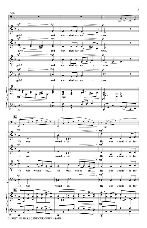 Uses: Good Friday, St. Thomas Sunday Scripture: Isaiah 53:4 This sterling Mark Hayes offering sets the classic Isaiah text with beauty and poignancy. Mark's careful craftsmanship of the text with the music is rich choral writing. The optional cello obbligato will add passion.