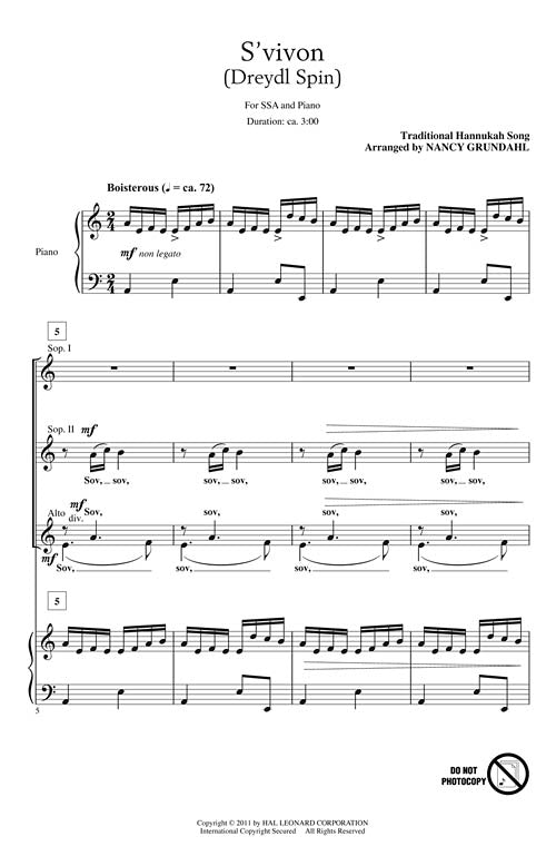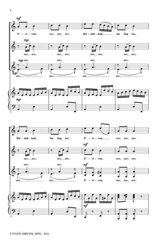 The imagery of the spinning dreydl is colorfully portrayed in the topsy-turvy accompaniment while the vocal lines dance above in lively fashion in this energetic setting of the traditional Hanukkah song.