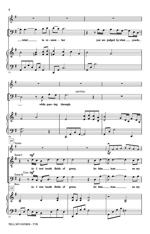 From The Civil War by Frank Wildhorn and Jack Murphy, this dramatic song brings the reality of war into strikingly personal terms as a young soldier sings of his father and his own mortality. A powerful choice for men's chorus! With violin. Available: TTB. Duration: ca. 3:53.