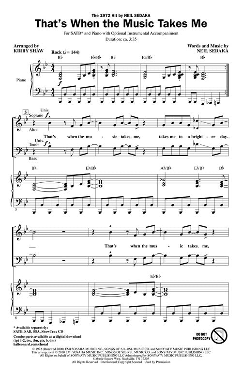 Here's a fun-fueled blast of nostalgia! The 1972 pop hit by Neil Sedaka is a joyful salute to the golden era of pop in an updated arrangement! A super choreography showcase ideal for all types of groups! Available separately: SATB, SAB, SSA, ShowTrax CD. Combo parts available as a digital download (tpt 1-2, tsx, tbn, gtr, b, dm). Duration: ca. 3:35.