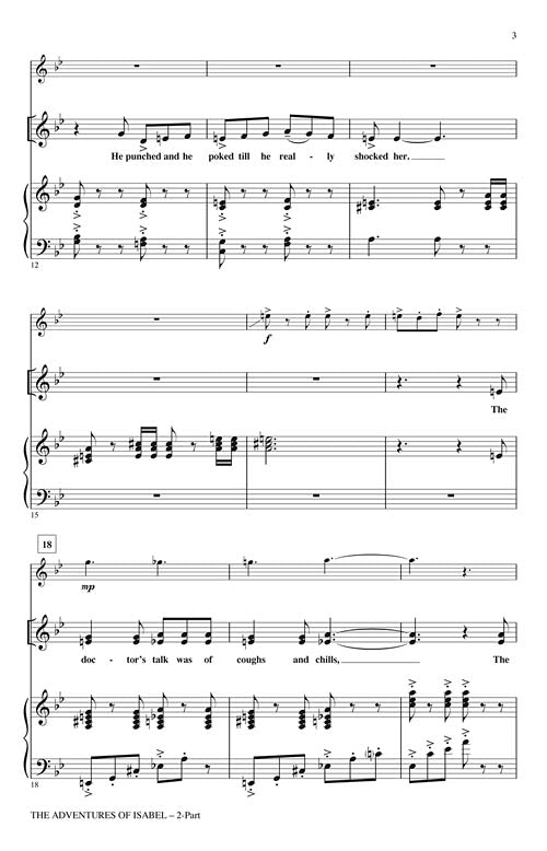 This delightful set of two Ogden Nash poems tells the story of the remarkable Isabel and her adventures. Excellent performance repertoire for younger choirs, your singers will display diction, dynamic contrast and rhythmic precision with these clever and humorous works! Includes Isabel and the Bear, Isabel and the Doctor. Includes oboe and bassoon parts. Duration: ca. 3:00.