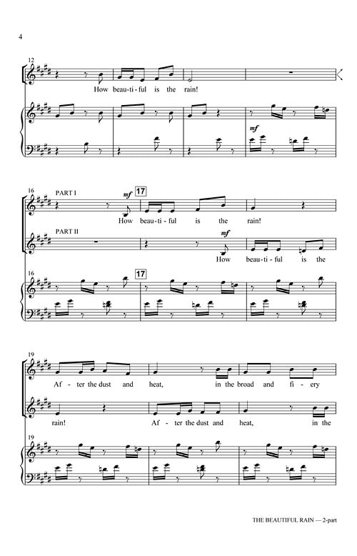 The words of Henry Wadsworth Longfellow are playfully set to music in this 2-part choral. The drip-drop piano part sets the scene and gradually the piece becomes more animated, playing between 2/2 and 6/8 meters. It is absolutely delightful when the section of vocal rain begins. Optional ad lib suggestions for use of rain stick and other percussion instruments are included. Available separately: StudioTrax CD. Duration: 2:37.