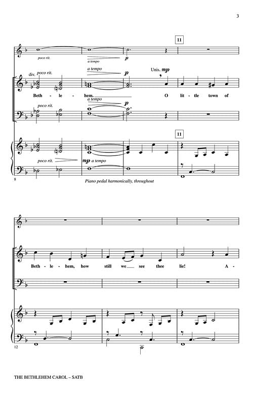 This arrangement features the two best-known settings of O Little Town of Bethlehem, interweaved over a gentle arpeggiated accompaniment that supports the expressive choral lines. Available separately: SATB, SAB, 2-Part. Duration: ca. 3:35.