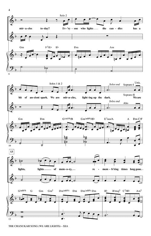 This lyrical and expressive original by Broadway composer Stephen Schwartz will be a welcome addition to December concerts. A beautiful accompaniment provides the perfect underlay for the message: we are glowing, growing miracles; we are lights. Performance Time: Approx. 3:10.Available separately: SATB, SAB, SSA and ShowTrax CD.