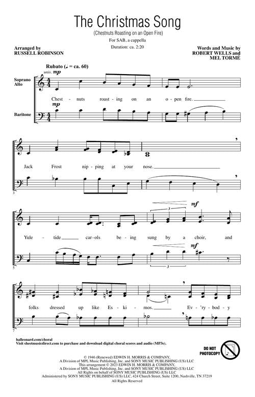 Perhaps your ensemble has sung The Christmas Song many times, many ways ... but this is a truly special treatment. Simple yet sophisticated, Russell Robinson's heartwarming a cappella arrangement gives the holiday classic a hint of jazzy harmonic freshness, yet retains a cozy flavor reminiscent of Christmases gone by.
