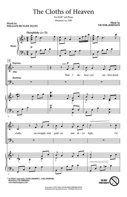 One of Yeats' most well loved poems from his third volume of poetry, The Wind Among the Reeds, is exquisitely set in this thoughtful choral work of romance and dreams. Careful painting of the text throughout creates a musical landscape for advanced choirs as well as developing voices.