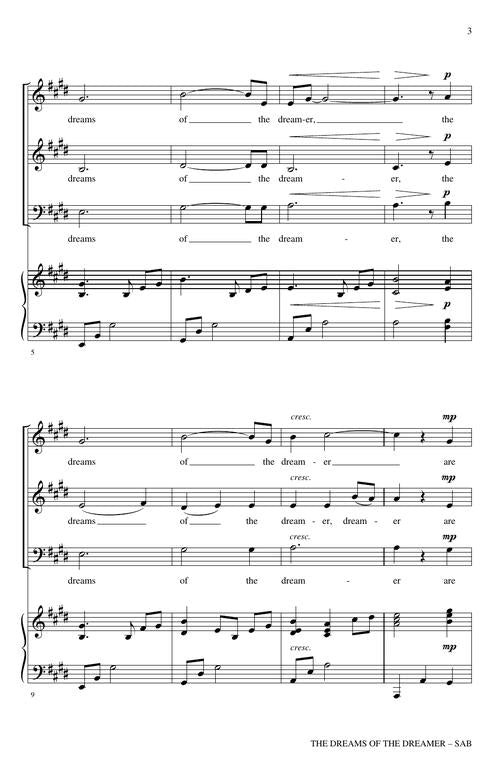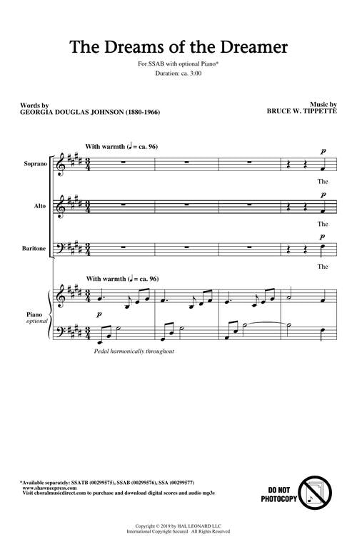 A warm arpeggiated piano begins this lush, new concert work for mixed as well as women's voices. Using the thought-provoking words of Georgia Douglas Johnson (1880-1966), harmonic richness begins right from the start and beautifully interprets the text, lifting the dreamer and singer in all of us.