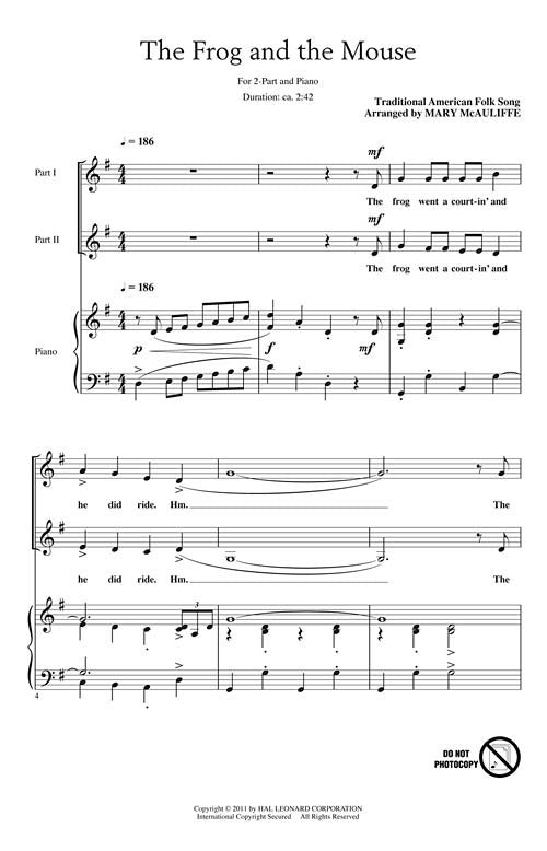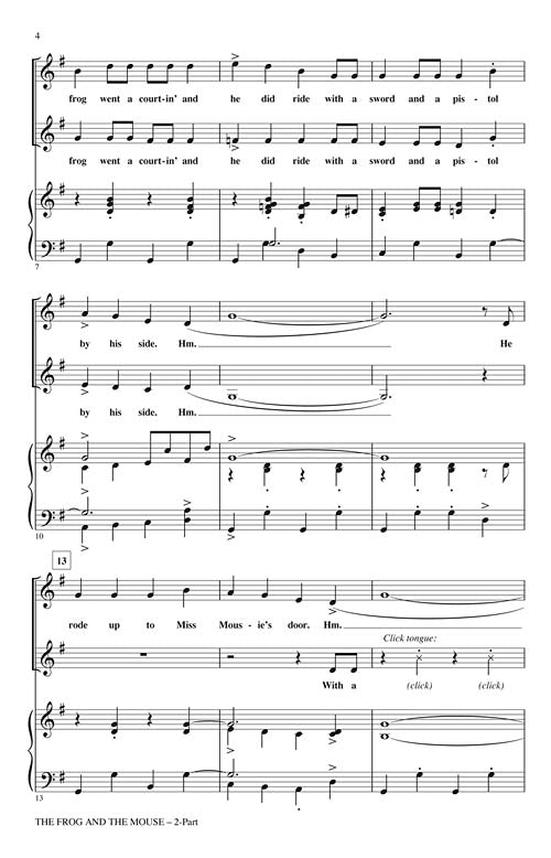 Here is an Irish composer's take on the American folksong classic Frog Went A-Courtin' in a colorful setting that features fun vocal effects and clever lyric twists, including an original contrasting middle section before the the final bread and cheese verse! Delightful!