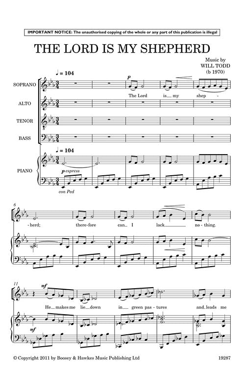 This setting was written as the 4th movement of Todd's 2009 Te Deum which was commissioned by the Vivace Chorus. Todd's jazz background is evident in this approachable but effective setting of the famous psalm text.