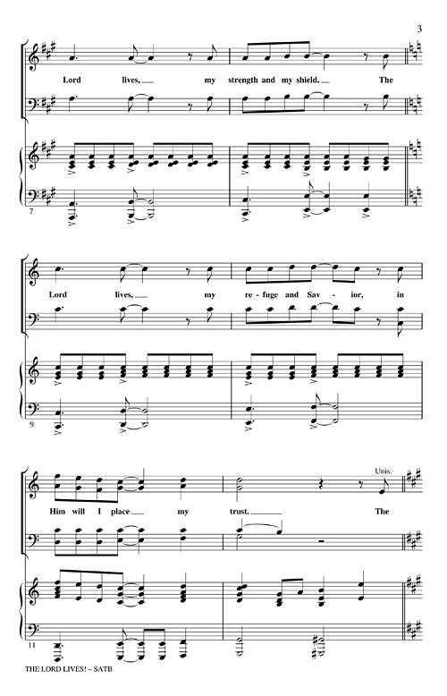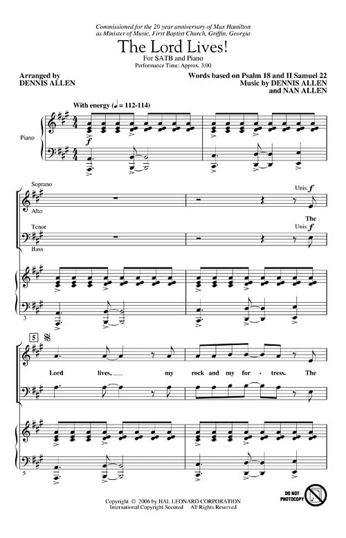 An original anthem of affirmation from Dennis and Nan Allen commissioned by the First Baptist Church of Griffin GA. The text is based on scripture while the music contrasts a rhythmic opening with a legato middle section. The Lord lives! He is my rock and my salvation! Useful for Easter season following Easter Sunday or other services of Confirmation or affirmation of faith. Performance Time: Approx. 3:00