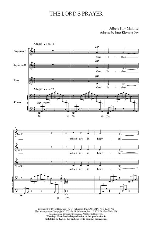 Available for the first time! The Lord's Prayer by Albert Hay Malotte is now available in the key of C, with a recorded accompaniment available on CD and orchestra score and parts. Ideal for church and sacred concert performance. Available for SATB, SAB, SSA and 2-Part. ChoirTrax CD available. Orchestral Pak also available. Performance Time: Approx. 2:30