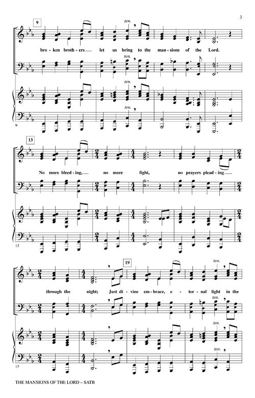 Originally on the soundtrack from the motion picture We Were Soldiers and performed at Ronald Reagan's funeral, this moving tribute to the members of the Armed Forces is once again relevant. To fallen soldiers, let us sing, Where no rockets fly or bullets wing, Our broken brothers let us bring To the Mansions of the LordAvailable separately: SATB divisi, SAB, 2-Part and TTBB. Concert Band Accompaniment (Gr.3), Optional String Pak and ShowTrax CD also available. Performance Time: Approx. 1:40