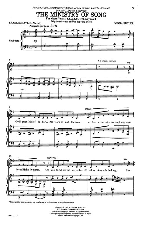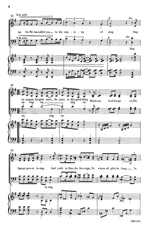 A simple octavo for SSATB with optional tenor and/or soprano solo for general use. Quick and spirited, it will put your audience in the mood to worship. Duration - 00:05:00.