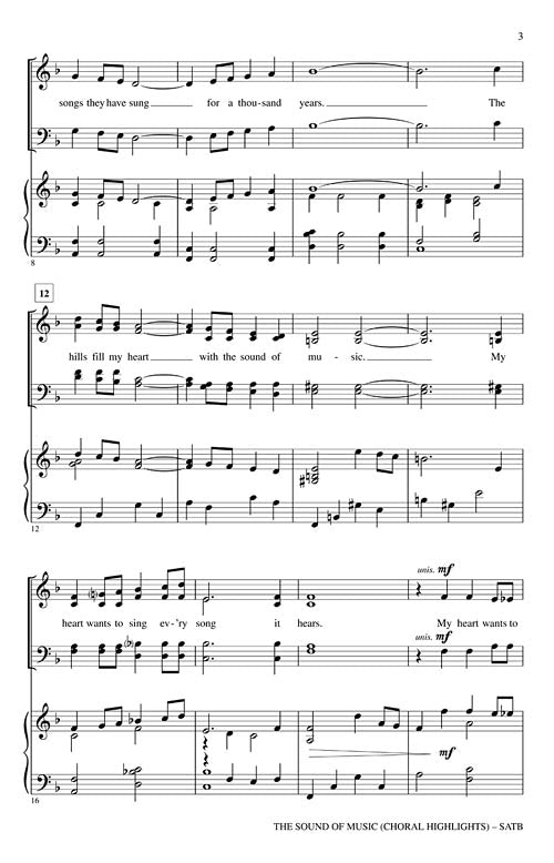 Four favorites from the Broadway classic The Sound of Music combine to make a charming addition to choral programs of all levels in this delightful 8-minute medley. Songs include: Do-Re-Mi, The Lonely Goatherd, My Favorite Things, The Sound of Music.