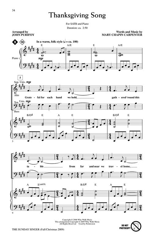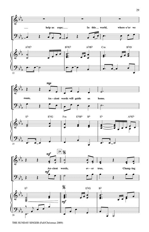 The Sunday Singer is a choral publication for smaller-sized church choirs that consists of several accessible anthems representing original works and arrangements of hymns and contemporary favorites. For each title, special attention has been given to voice leading, limited vocal ranges and carefully crafted piano accompaniments. Published two times a year, The Sunday Singer will serve as a valuable resource for your choir throughout the church year. The Fall/Christmas 2009 issue includes five titles: Give Thanks with O Come, Let Us Adore Him (arr. Philip Keveren) · He Made a Way in a Manger (arr. Camp Kirkland) · Carry the Light (arr. Keith Christopher) · Ancient Words (arr. Marty Parks) · Thanksgiving Song (arr. John Purifoy). Available separately: Choral Book, ChoirTrax CD, Kit (10 Choral Books, 1 ChoirTrax CD, 1 Preview CD), Choral Book 10-Pak, Preview CD, Preview CD 10-Pak, Preview Pak (1 Choral Book, 1 Preview CD).