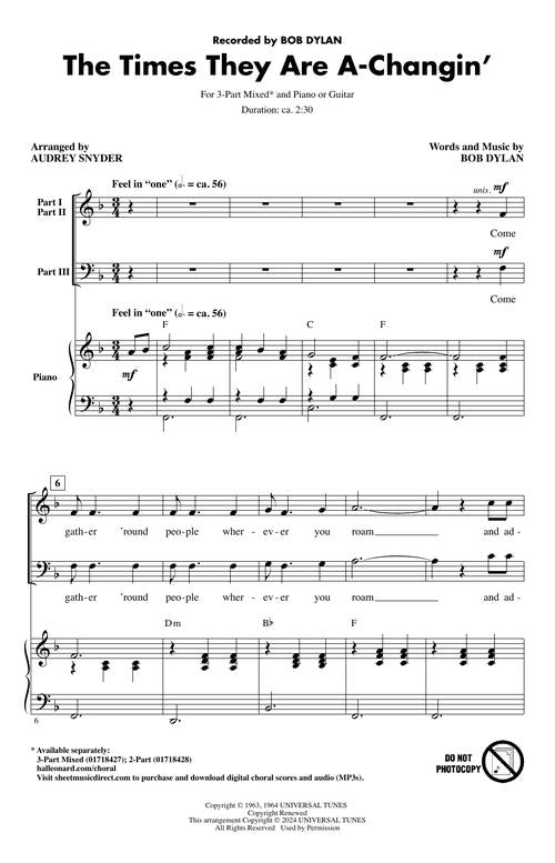 Nobel Prize winner, Bob Dylan wrote this legendary, classic folk ballad in 1963. Some would say the song is prophetic even today. Skillfully arranged to be very accessible for young singers, this arrangement may be accompanied by either piano or acoustic guitar.