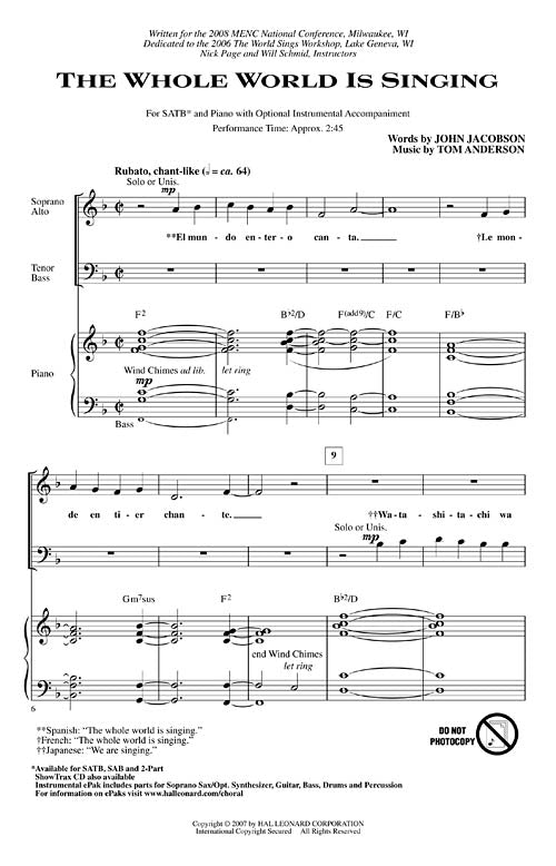 Enjoy this joyful celebration of the music of the world with this multicultural original. It includes phrases in over fourteen different languages and a great world drumming accompaniment. A super concert opener!Available separately: SATB, SAB, 2-Part, Instrumental ePak-Combo and ShowTrax CD. Performance Time: Approx. 2:45