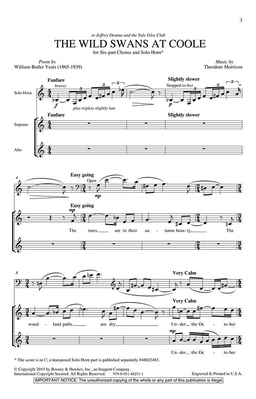 American composer and conductor, Theodore Morrison, has set this lovely William Butler Yeats' poem filled with Irish musical quotes. As an opera composer, Morrison has a strong grasp on the emotional impact made possible through programmatic music and he uses this in effective ways in this piece. The virtuosic nature of the horn part and advanced choral music require an accomplished ensemble, but the results will be impressive! href=https://youtu.be/okIH0UOiRKg target=_newScorePlay - click to view score with recording./