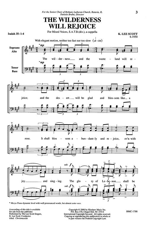This restrained yet rather elegant rendition of Isaiah 35:1-4 is fairly difficult, but worth the effort. Although the emphasis is on the renewal of nature and humanity, this piece is suitable for Advent as well as many other occasions. Difficulty Level: Medium Adult. Duration - 00:02:15.