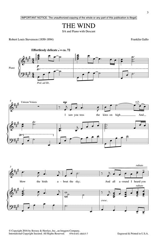 This is an appropriate work for the developing treble choir. The range and tessitura of the vocal parts lend themselves to cultivating skills of developing singers while giving teachers the opportunity to introduce many common compositional techniques. The Wind transports one to the fanciful, playful, and sometimes mischievous youth that is eternally heard in the howls of the wind.