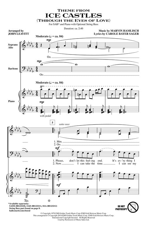 The creative genius of the late Marvin Hamlisch is unmatched in the world of movie music! This lovely setting of the theme from the 1970s film Ice Castles features a soloist and warm, expressive choral parts and supportive accompaniment. String bass part included.