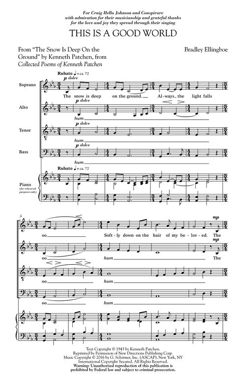 Moved by the horrific Orlando night club shooting in June of 2016, Ellingboe set this poem to music as an outpouring of grief, yet also of hope, that all is not lost and that, indeed, This Is A Good World. The Kenneth Patchen poem was written and published during some of the darkest days of the Second World War. It reminds us that war will not last and, though some do go mad, God will not forget us.