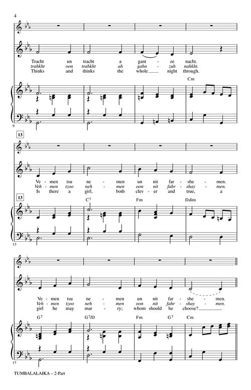 The title of this Yiddish folk song informs us that a Balalaika will at least be inferred in the music. This wonderfully authentic arrangement does just that. It also includes a clarinet obligato (included in the back of the octavo) which is a tip of the hat to the Klezmer band. A Yiddish, phonetic and English text are all provided in the music allowing you to perform this work in any combination of Yiddish or English.
